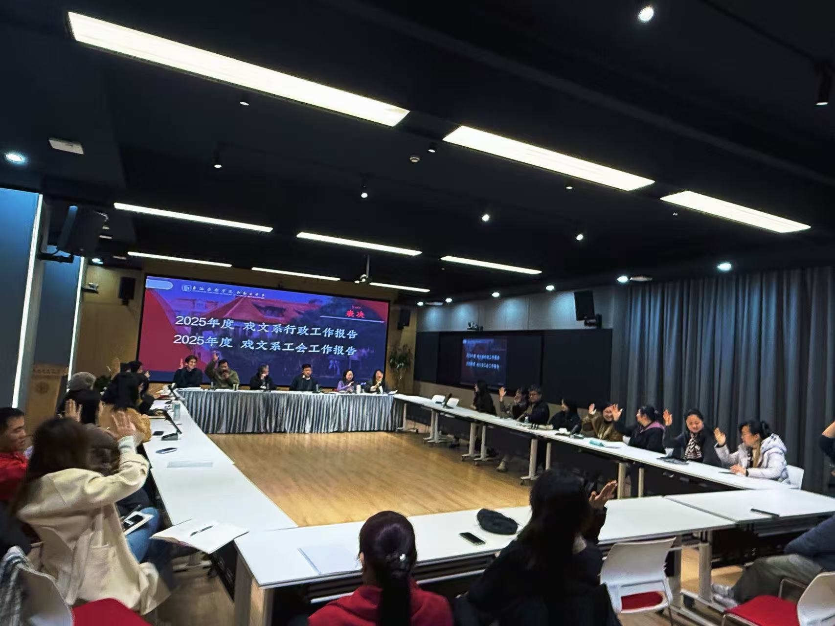 与会教职工以举手表决的形式,全票通过《2025年度戏剧文学系行政工作报告》《2025年度戏剧文学系工会工作报告》。
