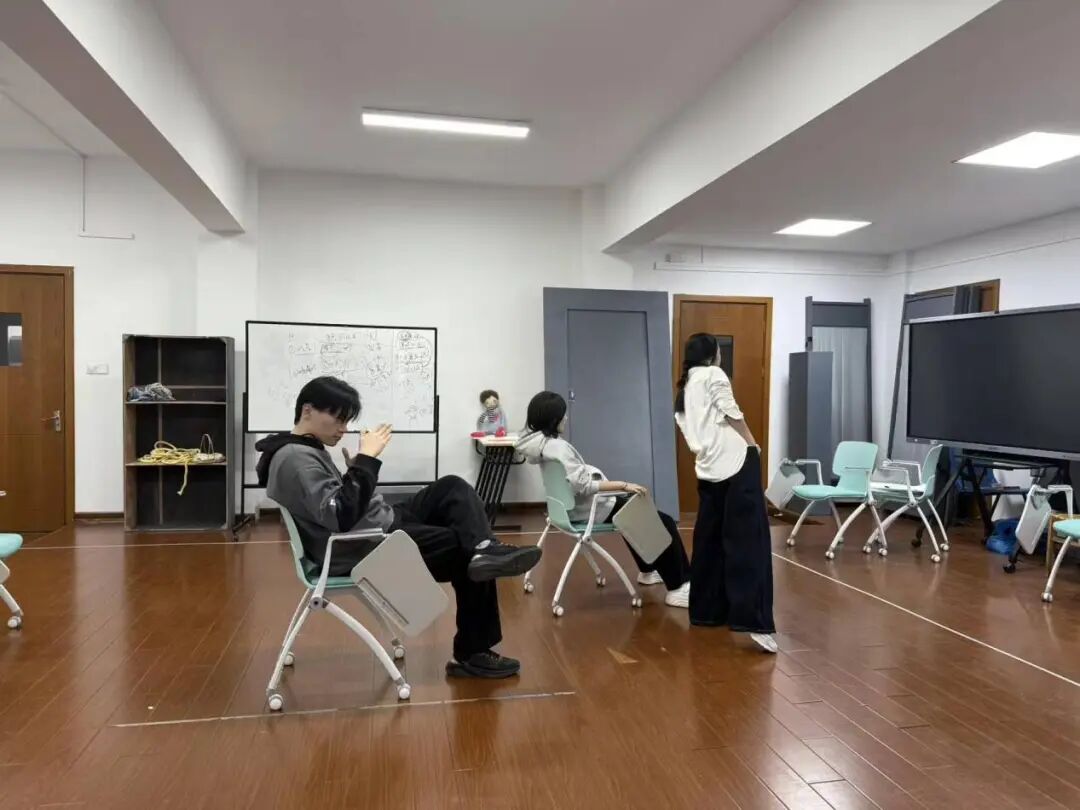 工作坊结束后,陈思敏随即牵头推进戏剧与游戏融合的表演训练及创排工作,快速确定主演团队,组织大家开展初步磨合,顺利完成了这种新形式的首次落地实践。经过一天的集中创排,主创团队成员不仅加深了彼此的了解,更在交流中相互学习、彼此启发。工作尾声,同学们围坐一堂集思广益,为戏剧创排与形式探索提出了诸多宝贵建议。
