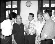 图为上戏党委书记贺寿昌与尚长荣、吴贻弓、焦晃、曹可凡等客座教授亲切交谈。