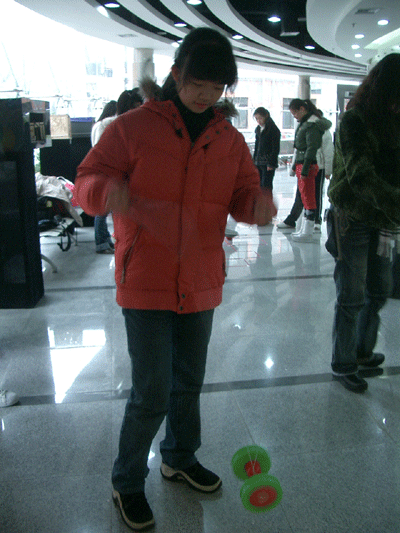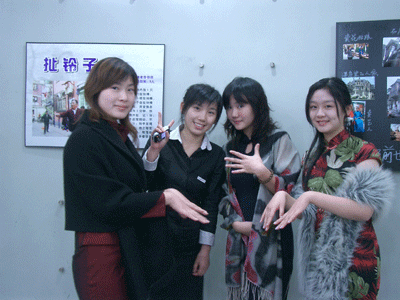 由于大伙儿的卖力工作,尤其是在寒冬身着老上海旗袍,长衫的宣传人员们,她们的献身出任,第二天的小剧场,人头躁动,远远从小剧场外的玻璃门望去,擦过眼球的是一个个为活动激情忙碌的工作人员,一个个在老上海风情熏陶下兴致勃勃扯着铃子,跳着房子的师生们,或是一个个尝着老上海小吃,不亦乐乎的美食者们,大家在各区域里各得其乐,各为其乐,但不容置疑的是展露于玻璃门前一道道欢快的亮影。其实当天的教师阵容十分强大,不仅有魏东晓,钱珏,汤逸佩,高城等本系老师,连宫宝荣,葛朗老师等校领导也一一亮相,然而很快他们便于我们打成一片,狠劲地抽着砣子,惊羡地观赏着专人表演,大口大口嚼着梅花糕,在寻找老上海的路途中,他们似乎忘记了年龄,他们似乎回到了与我们一样的学生时代,是学生还是老师在当天的小剧场中都化作了一道活力的身影,化作了老上海风情的一道幽香。