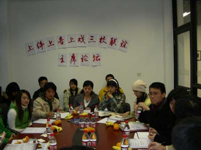 12月21日下午,由我校主办的“三校联谊主席论坛”在图书馆顺利举行。上音、上体及我校的学生会主席及部长都出席了此次会议。会议本着三校同论,共谋发展的宗旨,对于由我校同学所设计的“三校联谊”的会标,三校之间的剧目交流及剧目资源共享问题,学生会如何对学生的发展作出重要贡献的问题,学生会如何组织学生进行更好的社会实践活动的问题,以及各校社团间怎样进行更深一步的交流等五项议题进行了深入的讨论。