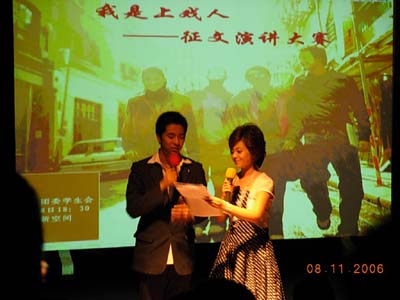 在主持人清晰而精准的说明了比赛规则之后,大屏幕上显现出了第一位选手,来自莲花路校区,06群文的胡婷婷同学。她深情而投入的演讲迅速在新空间的上空积聚起一股滚滚的激情蜜意。随后陆续登台亮相的11位来自不同系别年级的选手,各显神通,在小小的演讲台前倾情宣泄着自己内心深处对上戏这个温馨家园的热爱与祝福。他们的演讲忽而慷慨激昂,忽而柔美雅致,忽而抑扬顿挫,忽而真切朴实。讲台上光彩熠熠的他们此时正是十二位上戏人的楷模,展示着十二个风采各异的美丽舞台,就像是绚烂多姿的上戏校园。在这股激荡的热力中,载着毕业生们对上戏家园无限的眷恋与感激,闪着新生美好的憧憬与梦想。