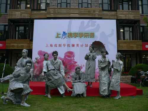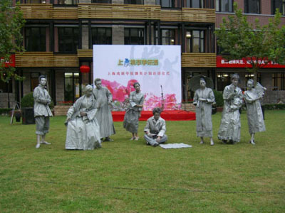 9月28日下午的红楼草坪上,是上戏学子张扬个性,展现自己的精神风貌的舞台。在这个舞台上,在舞台的各个角落都充满着无数的欢笑和坚定的眼神。没有灯光的照射,依然绚丽夺目;没有鲜花掌声,依然活力四射;因为大家拥有的是同一个梦想,在努力实现着这个梦想。全身被涂成银色的表演06的同学在草地上演绎着艺术人生,如同从画中走出的人,亦真亦假,他们摆成许多不同的造型,就像是在述说着一个个生动的故事,在人生的海洋中成为一叶叶轻舟,在漂泊中寻找着方向,而最后停靠在上戏这个美丽而值得骄傲的校园里。在舞台的另几侧分别有昆曲的同学在进行昆曲表演,舞美设计同学们的现场涂鸦,以及导演04的话剧片段台词展示,都在用自己的行动来追寻艺术,表达对它的真挚热爱。