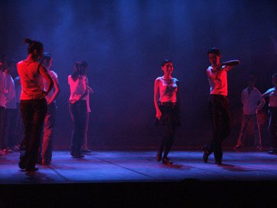 这次的晚会汇萃了上戏学生的热情和活力, 06级表演系音乐剧班的的王紫璇、郭凌霞等7人的为我们带来青春活泼的爵士舞《黑天使》。他们的舞蹈不仅专业,而且极其的默契。“他们在我们审节目的时候,还表现出了一种特别专注,特别热情的精神……光是审批节目的时候我们就看不只5、6遍,而他们每一遍也都很投入,令我们非常感动。”此台的晚会的导演王萌这样感叹道。此外,音乐剧班的同学仍不尽兴,然后又为我们带来了同样的精彩的歌舞《呛司呛司》,再次为同学们带来了愉悦。