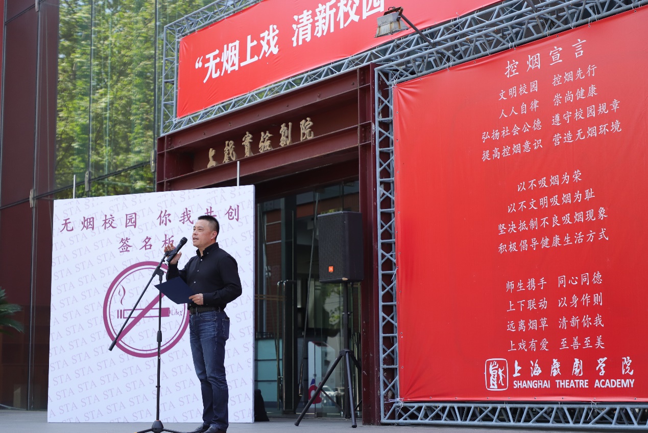 上戏实验剧院前广场,春意盎然,师生齐聚。他们庄严宣誓:“以不吸烟为荣,以不文明吸烟为耻,坚决抵制不良吸烟现象,积极倡导健康生活方式;全体师生,同心同德;上下联动,以身作则;远离烟草,清新你我;上戏有爱,至善至美。”