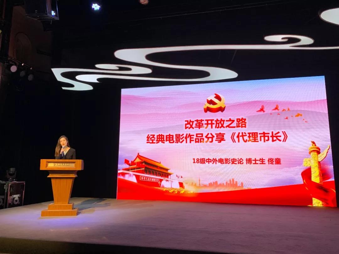 随后,18级中外电影史论专业博士研究生佟童为我们隆重介绍了由上戏校友、著名导表演艺术家杨在葆先生自导自演的经典电影作品《代理市长》,不仅让同学们深入了解到 “改革开放之路”的艰辛与不易,还深刻体会到老一辈艺术家对信仰的坚持、对艺术的坚守。另外,佟童还结合自己导演的创新戏剧《历史瞬间》,分享了用“戏剧”元素为爱国主义宣传教育注入活力的成功经验,使同学们受益匪浅。