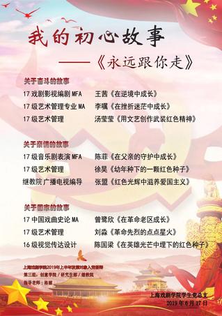 创意学院17级艺术管理专业的徐昊同学,分享自己初心故事源于父亲与外公从小的感染,她的父亲与外公都是退伍军人,在他们的身上,她看到了身为一名中国共产党员的信念、责任感与使命感。长大后的她,终于有机会用自己的方式向党组织靠拢,入学后的这两年,她也身体力行地做着力所能及的文艺创作工作,也逐渐坚定了她一心向党、向党组织靠拢的决心!