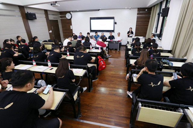 汇报结束,便意味着离别将近。727日下午,上戏红楼209,这间教室记录着学员们埋头写作的身影,老师们点评作业的声音,专家们坐而论道的场景。此时窗外雷声阵阵,大雨滂沱,教室内充满了离别的伤感,于是发生了本文开头的一幕。学员们穿着印有编剧工作坊logoT恤,前来为他们送别的人们有:上海市教委副主任倪闽景,上海市教育学会秘书长苏忱,上海市教委体卫艺科处处长陈华,上海戏剧学院党委副书记胡敏,上海戏剧学院党委副书记、副院长张伟令,上海戏剧学院副院长刘庆,上海戏剧学院学术委员会主任叶长海,上海戏剧学院创作中心主任赵韫颖,上海戏剧学院戏文系主任陈军。众多大咖云集于此,足以见得各级领导和各位专家对编剧工作坊及学员们的高度重视。