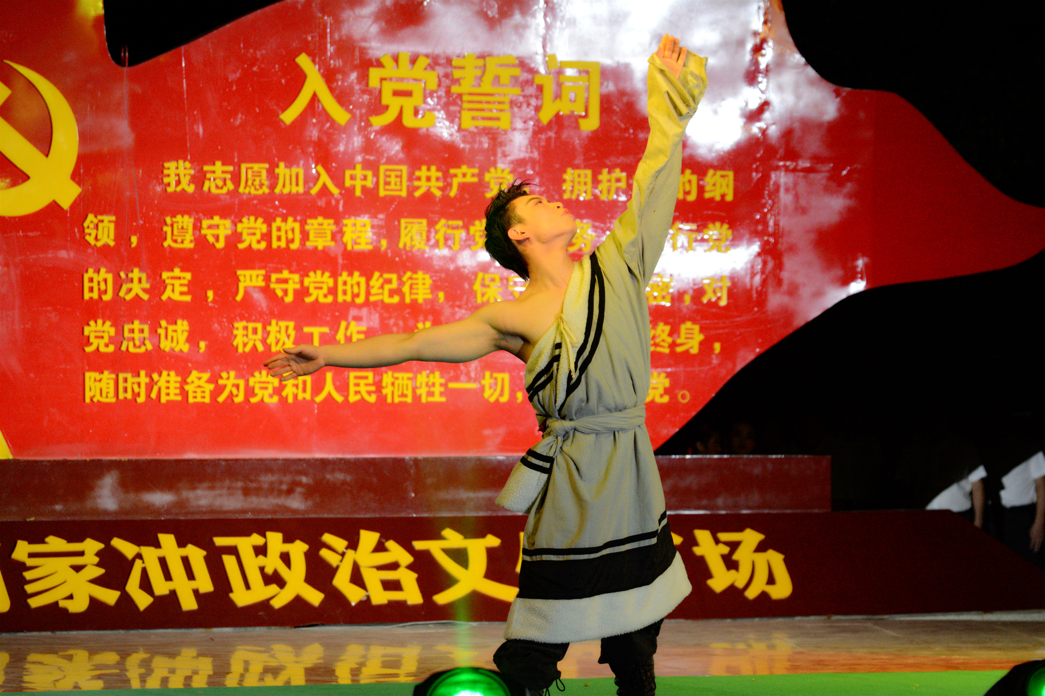 专场文艺晚会上,来自于上海戏剧学院暑期社会实践团的师生和信阳市文化旅游系统的文艺工作者们合作为革命老区何家冲的乡亲父老们带去了一场内容丰富,形式多元,精彩纷呈的综合性文艺演出。现场的节目从舞蹈到歌曲再到传统戏曲,每一个作品都倾注了创作者与表演者的热情与专注,台上演的精彩,台下掌声欢呼声此起彼伏,高潮迭起。实践团中来自于舞蹈学院中国舞专业的8位同学为本次文艺晚会带来了精心排演的女子四人舞《吉祥》、男子独舞《渡生》、女子群舞《采薇》、男子四人舞《英魂》和女子独舞《红蜻蜓》,精湛的舞技,优美的舞姿、用心的演艺,赢得了当地老百姓真挚地欢呼。;来自继续教育学院音乐表演专业的5位学生与专业教师石灵带来了3首由该专业负责人张重远老师领衔师生新编经典歌曲:男女对唱《红旗飘飘》、吉他弹唱《渔光曲》、合唱《同一首歌》,优美而现代的旋律打破了传统经典歌曲的固有节奏,让人耳目一新,学生们独特的嗓音与生动的演唱,老师用心的演奏与纯熟的技巧,获得了大家的肯定与掌声。