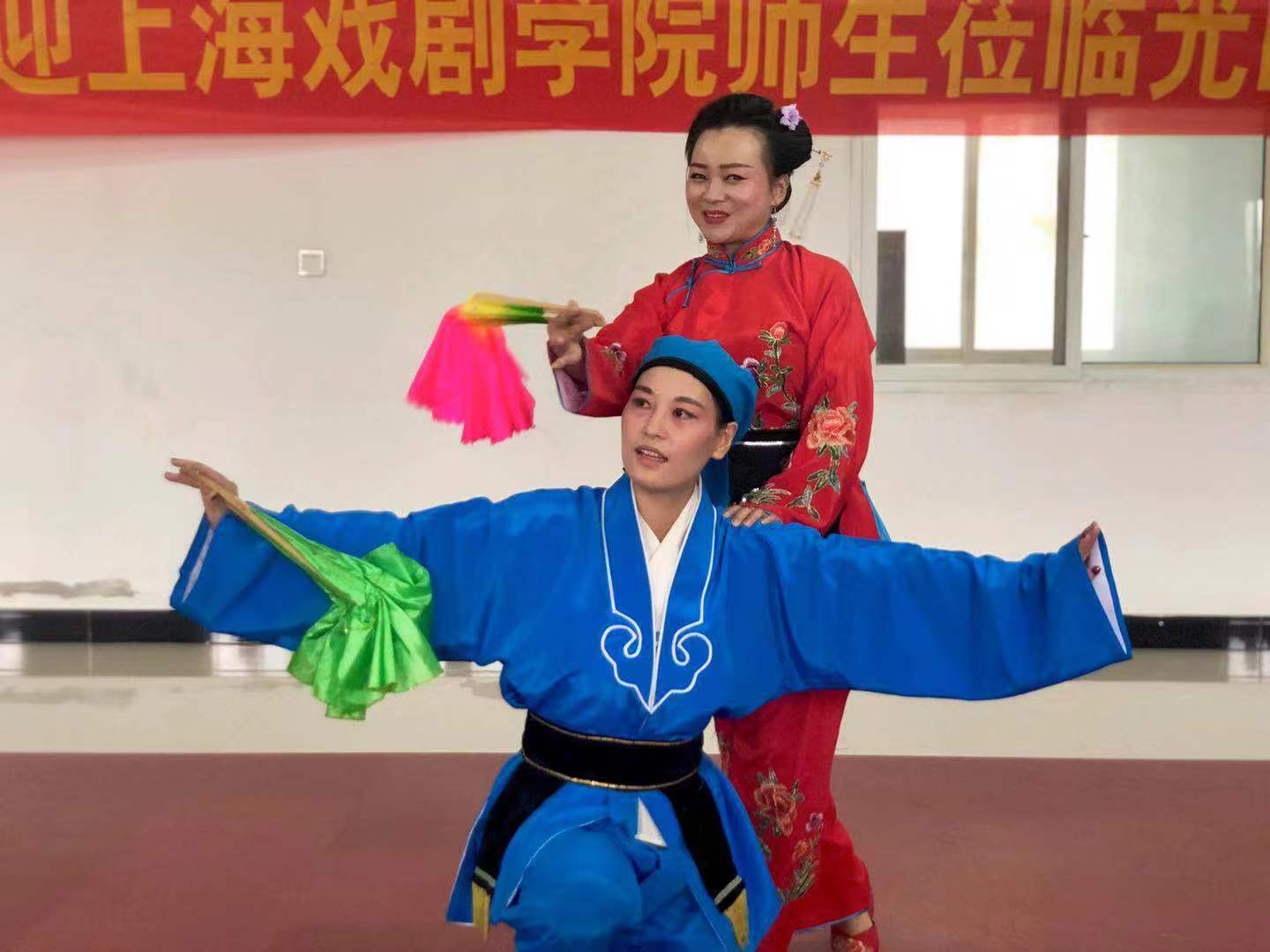 下午,师生们一行来到了光山县花鼓戏传承中心,进行艺术观摩与交流。光山县花鼓戏艺术家们为我们表演了传统经典花鼓戏片段《夫妻观灯》和《顶椅》。作品传承着中华传统文化的不朽魅力,同时也讴歌新风新貌、新变化,凸显了信阳本土文化的地域特色。在了解了光山花鼓戏传承中心对花鼓戏的传承与研究所做出的努力和取得的成就,让在场的师生由衷地感受到了对稀有剧种的活态传承的重要性,同时也感受到了稀有剧种的独特魅力,积极推动稀有剧种健康发展的迫切性,希望通过更多的人来留住民族文化的根脉。看完精彩的演出后,上戏实践团的同学们也交流了自己的专业,展现了独特的舞姿,也交流了自己的直观感受与体会。