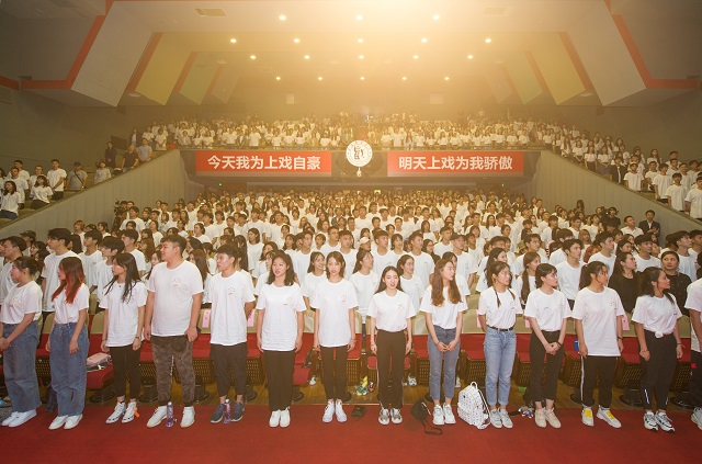典礼的最后进行了校旗传接仪式。在令人振奋、催人奋进的上戏校歌歌声中,党委书记谢巍将校旗从在校生代表的手中传递到了新生代表的手中,2019级新生全体起立,面向校旗郑重宣誓,表达了上戏人的艺术品德和家国情怀。