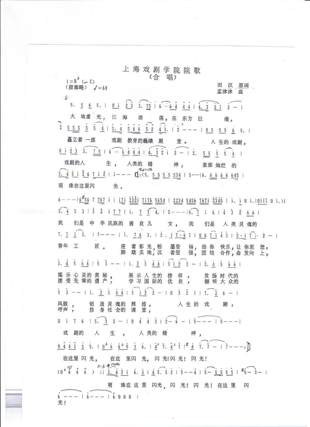 承载着校训精神的校歌由田汉于1947年所作,饱含了作者对戏剧崭新未来的希望,为戏剧教育指明方向。1946年即将上任校长的熊佛西先生和田汉先生相约在北四川路凯福饭店,席间熊佛西对田汉说:“为剧校写一个校歌吧。”田汉沉吟了片刻,便爽快地答应了。很快田汉写的校歌歌词送到了学校。