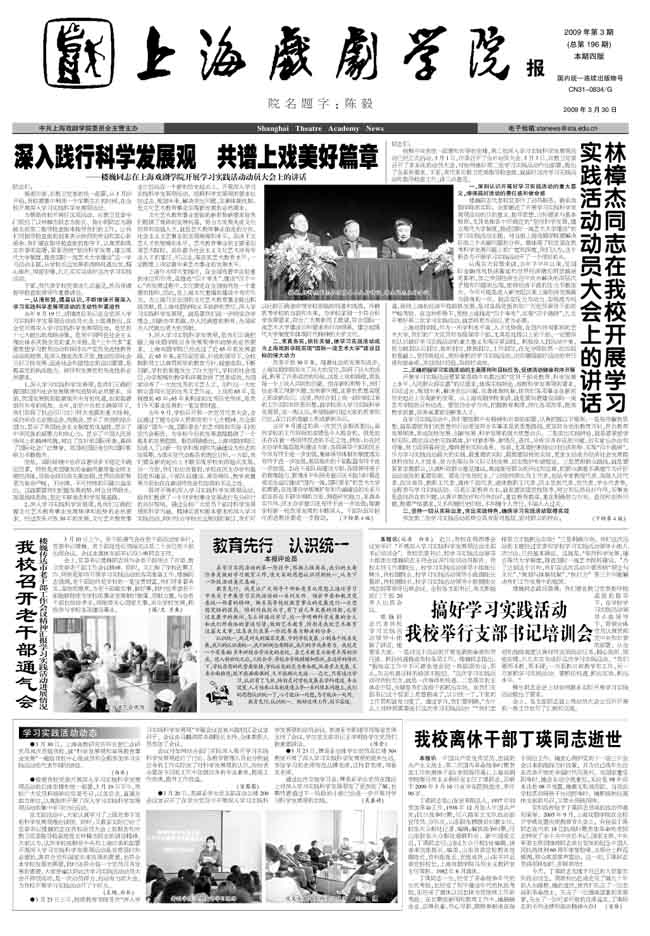 《上海戏剧学院报》2009年第3期已出版(总196期)已于2009年3月30日出版。本期重点内容有:《楼巍同志在上海戏剧学院开展学习实践活动动员大会上的讲话》、《林樟杰同志在我校开展学习 实践活动动员大会上的讲话》、《我校召开老干部通气会》、《搞好学习实践活动 我校举行支部书记培训会》、《学习实践活动动态》、《我校离休干部丁瑛同志逝世》、《校纪委召开工作会议 研究党风廉政建设干部大会议程》等,敬请关注。也可从点击院报栏目下载观看。(图文/小河 编辑/雨田)
