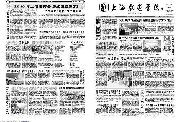 《上海戏剧学院报》2010年第4期已于2010年4月25日出版(总第209期),共四版,本期重点内容有:《情系玉树抗震救灾》,《上戏玉树心连心》,《支援玉树 爱心无疆》,《创意学院学生在写生地致哀 蒲巴甲再次为灾区捐款1万》,《上视新闻频道、《新民晚报》报道我校捐款消息》,《“让爱滋润大地”——我校师生为西南五省抗旱赈灾奉献爱心》,《我校召开建设学习型党组织研讨会》,《创意学院举行学习型党组织主题活动》,《我校召开2010年版教学计划审议会》,《世博会志愿者宣誓上岗仪式举行——我校63名师生代表参加宣誓》,《我校举办“泰国电影展映暨国际研讨会”》,《我校举办“汤显祖与临川四梦国际学术研讨会”》,《我校赴非洲三国演出》等,敬请关注。(图文/谷晴 编辑/谷晴)