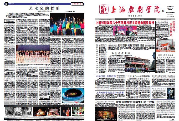 《上海戏剧学院报》2010年第12期(总第217期)已于2010年12月10日出版,本期共四版,一、四版为彩版。重点内容有:《上海戏剧学院六十五周年校庆主题晚会隆重举行》、《祝福祖国:明天更美好!——我校举行校庆升旗仪式》、《向“奠基者致敬”——我校举行熊佛西诞辰110周年纪念活动》、《雨果、莫里哀雕像落成仪式在我校举行》、《“红楼·梦”——大型多媒体主题秀暨校友冷餐会举行》、《余秋雨教授写给学生们的一封信》等,敬请关注。也可点击下载观看。(图文/戎戎 编辑/戎戎)