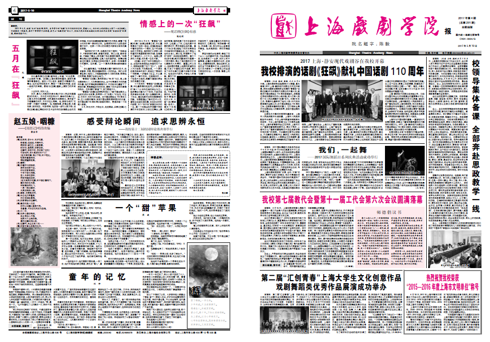 《上海戏剧学院报》2017年第4期(总第291期)已于2017年5月10日出版,本期套红,共四版。重点内容有:《2017上海•静安现代戏剧谷在我校开幕 我校排演的话剧<狂飙>献礼中国话剧110周年》、《校领导集体备课 全部奔赴思政教学一线》、《我们,一起舞——2017国际舞蹈日系列庆典活动成功举行》、《我校第七届教代会暨第十一届工代会第六次会议圆满落幕》等。敬请关注,也可点击下载阅读。(文、图、编辑:榕树)