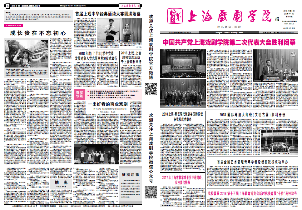 《上海戏剧学院报》2018年第5期(总第301期)已于2018年5月30日出版,本期套红,共四版。重点内容有:《中国共产党上海戏剧学院第二次代表大会胜利闭幕》《2018上海•静安现代戏剧谷国际论坛在我校成功举办》《2017年上海市教学成果奖评选揭晓,我校喜传捷报》等。敬请关注,也可点击下载阅读。(文、图、编辑:榕树)