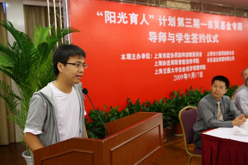 2009年9月17日,“阳光育人”计划第三期――东吴基金专期导师与学生签约仪式在市政协举行,11名少数民族大学生与导师签约,市政协副主席钱景林出席签约仪式。我校侗族同学、戏文系08级饶俊同学受到该项计划资助,并作为受助少数民族同学代表发言,表示要珍惜这个机会,努力将少数民族的灿烂文化发扬光大,以回报社会的关爱。(图文/张洁 编辑/雨田)