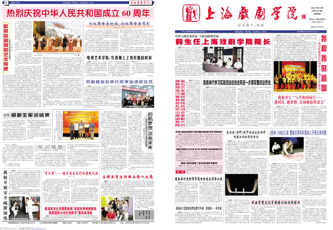 《上海戏剧学院》2009年第9期已于2009年9月30日出版(总第202期),本期四版,本期重点内容有:《韩生任上海戏剧学院院长》、《我和我的祖国――我校昨隆重举行国庆六十周年文艺晚会》、《我校举行“与共和国同行――迎国庆、迎世博、弘扬师德座谈会”》、《楼巍同志代表我校赴京出席国务院第五次全国民族团结进步表彰大会》、《我校举行学习实践活动总结会和进一步落实整改动员会》、《田恩荣、钱镇威老师喜获“首届中国职业院校教学名师”等荣誉称号》等,敬请关注。(图文/小河 编辑/雨田)