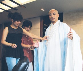 到音乐剧《弘一法师》的排练场采访宋怀强的那天,正是上海大幅度降温的日子。音乐剧已经进入联排阶段,每天都要忙到半夜才收工。休息室里,理了光头的宋怀强,手上缠着佛珠,温和宁静的模样。他说,最近一段时间自己在吃素减肥,因为弘一法师是个清癯的人。