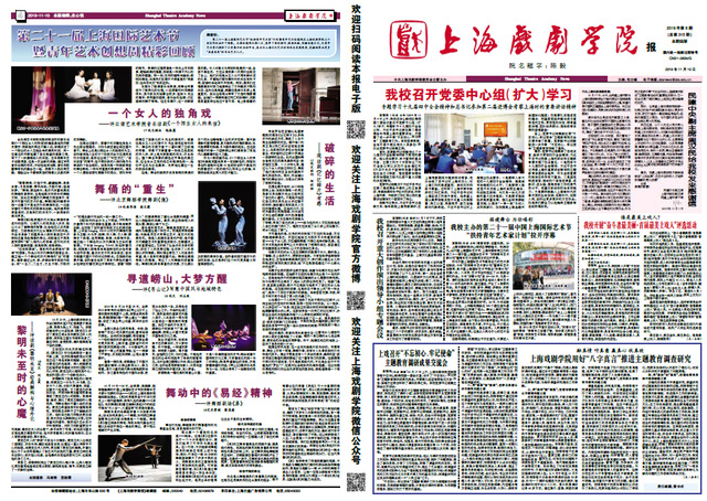 《上海戏剧学院报》2019年第8期(总第315期)已于2019年11月10日出版。重点内容有:《我校召开党委中心组(扩大)学习》《民建中央副主席周汉民给我校发来感谢信》《我校召开重大创作演出领导小组专题会议》《搭建舞台 为你喝彩 我校主办的第二十一届中国上海国际艺术节“扶持青年艺术家计划”拉开序幕》等。敬请关注,也可点击下载阅读。(文、图、编辑:榕树)