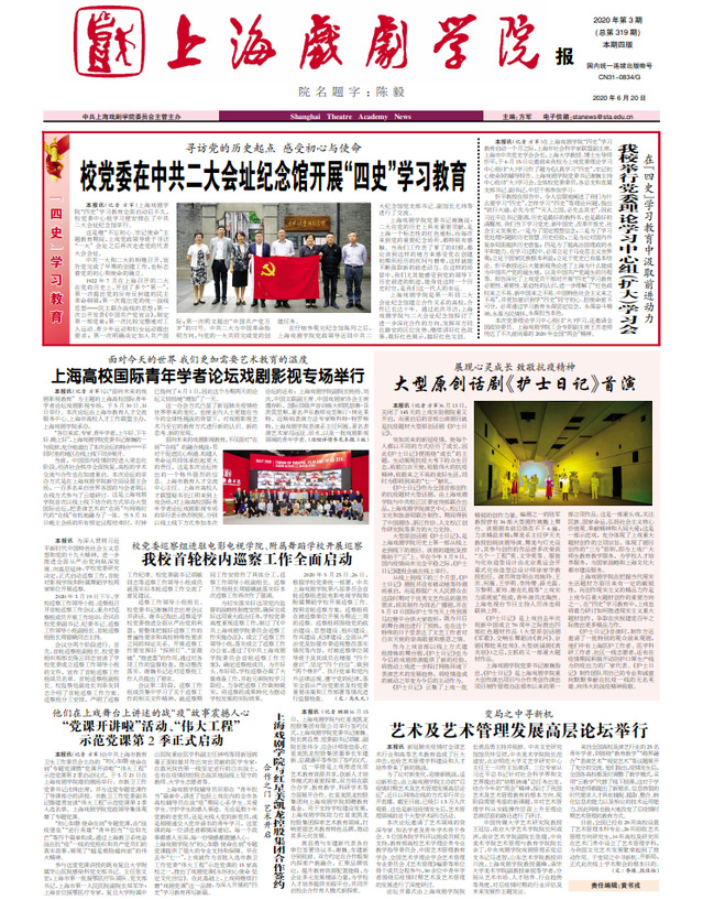 《上海戏剧学院报》2020年第3期(总第319期)已于2020年6月20日出版。重点内容有:《寻访党的历史起点 感受初心与使命 校党委在中共二大会址纪念馆开展“四史”学习教育》《在“四史”学习教育中汲取前进动力 我校举行党委理论学习中心组(扩大)学习会》《面对今天的世界 我们更加需要艺术教育的温度 上海高校国际青年学者论坛戏剧影视专场举行》等。敬请关注,也可点击下载阅读。(文、图、编辑:榕树)