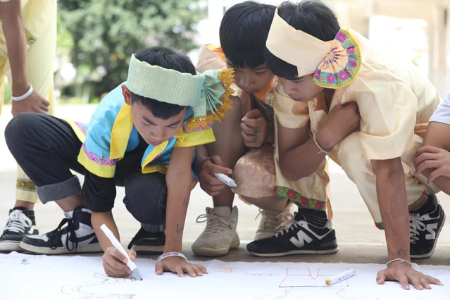 王琦老师作为影视学院的志愿者代表,为孩子们带去了影视学院张大鹏老师专门为孩子们定制的笔记本和音频节目以及影视学院主持专业学生为山区孩子录制的短音频节目。此外,上海非遗西郊农民画传承人胡佩群老师准备的绘画材料、申庞轨交维修公司赠送的一千册图书、乒乓球世界冠军丁宁亲笔签名的球拍等,这些志愿者们准备的礼物都受到勐宋中学师生的热烈欢迎。