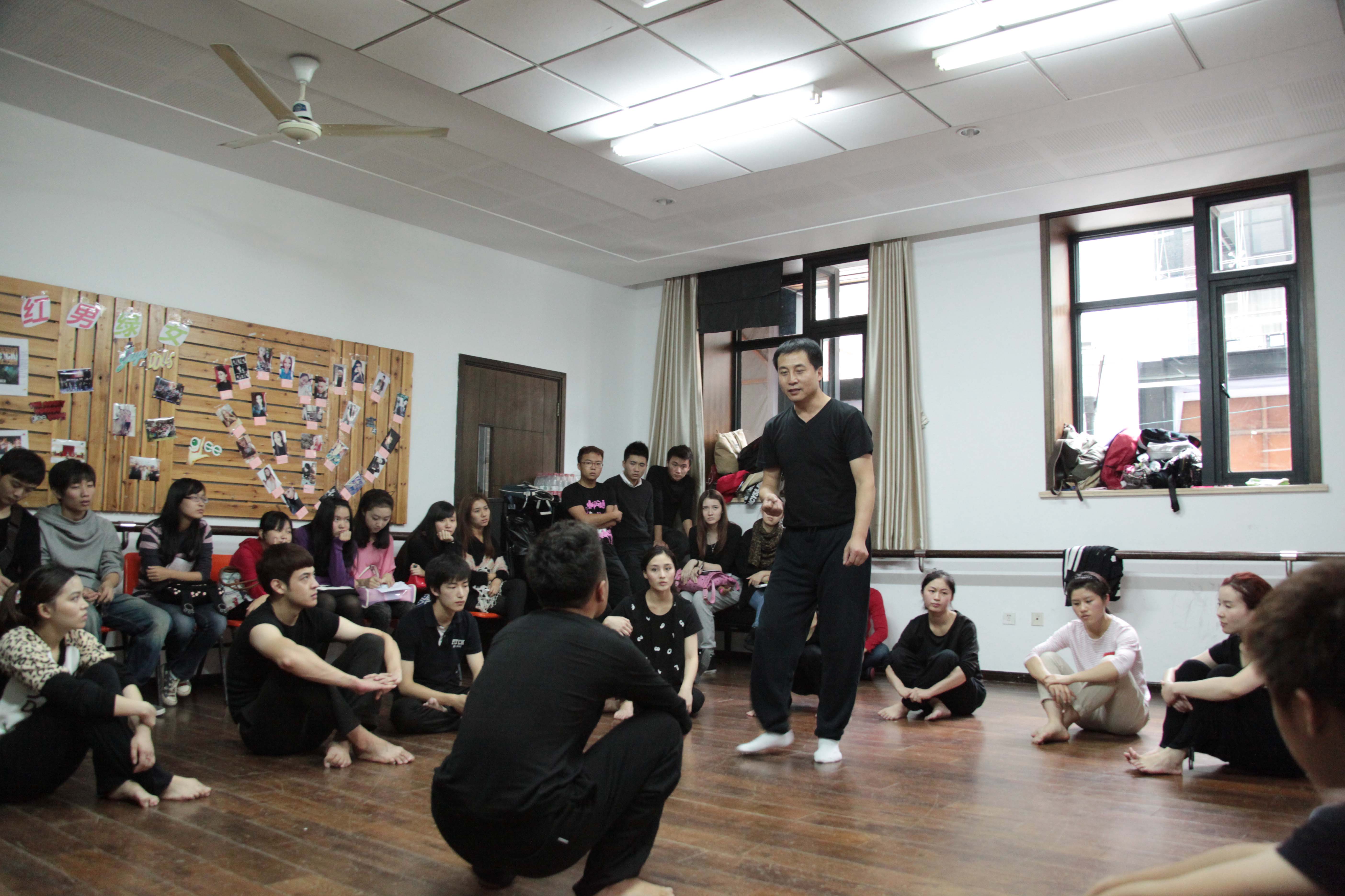 他用音乐将学生带入一个只属于他们的世界,让他们用身体去触碰音乐,这是演员的音乐性,不用于煽情,而是一种自然的表达。他亲切地纠正学生僵硬的姿势,告诉他们就像身上带了珠子一般,用身体去抓音符。让他们在地板上随着节奏踏步,把身心完全投入于这个环境中。在传送带练习中,同学们放开了自己,注意力高度集中,反应力也很强,他通过学生两次的变化强调了发展,去感知更细腻的东西和情感。