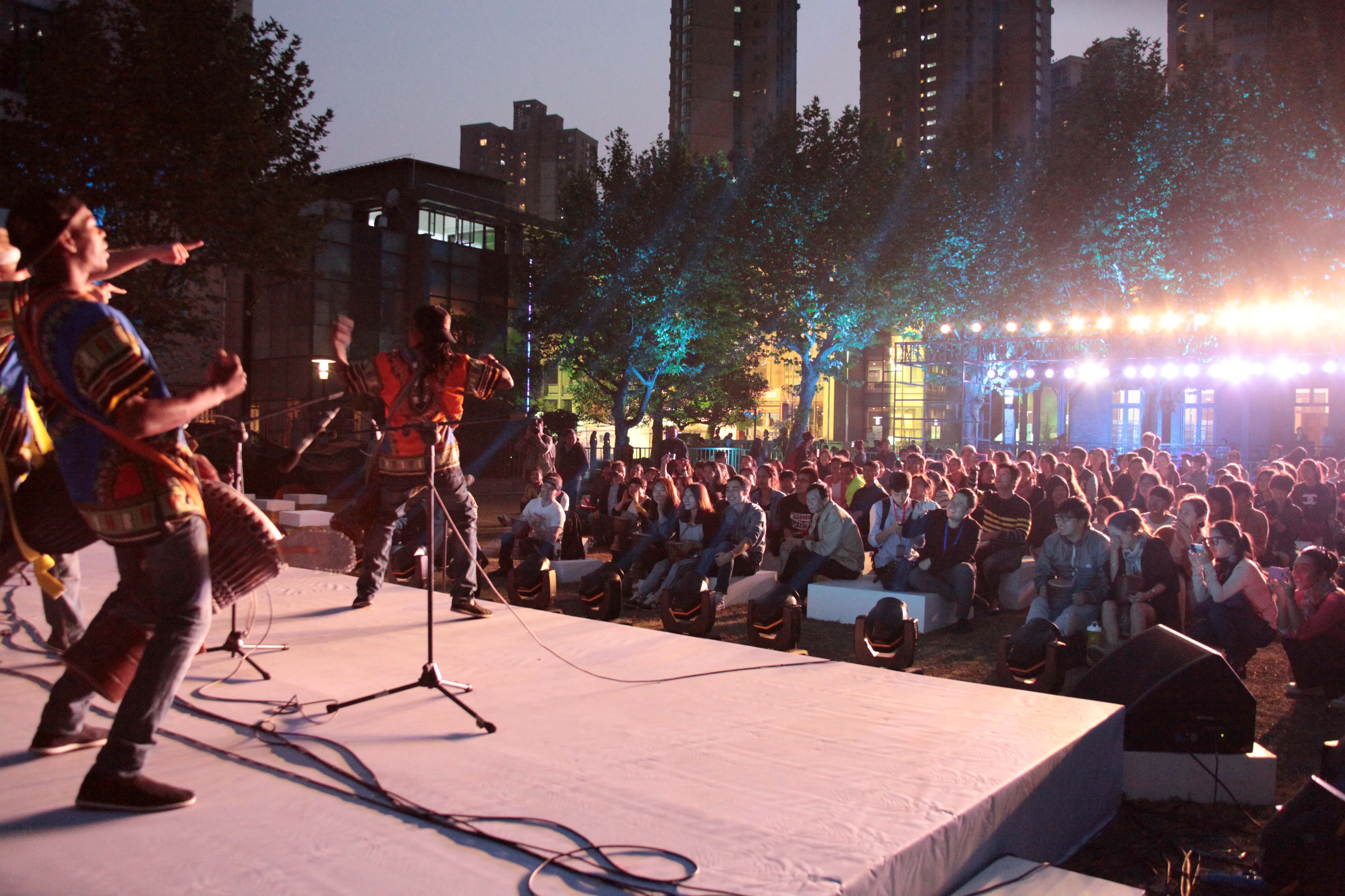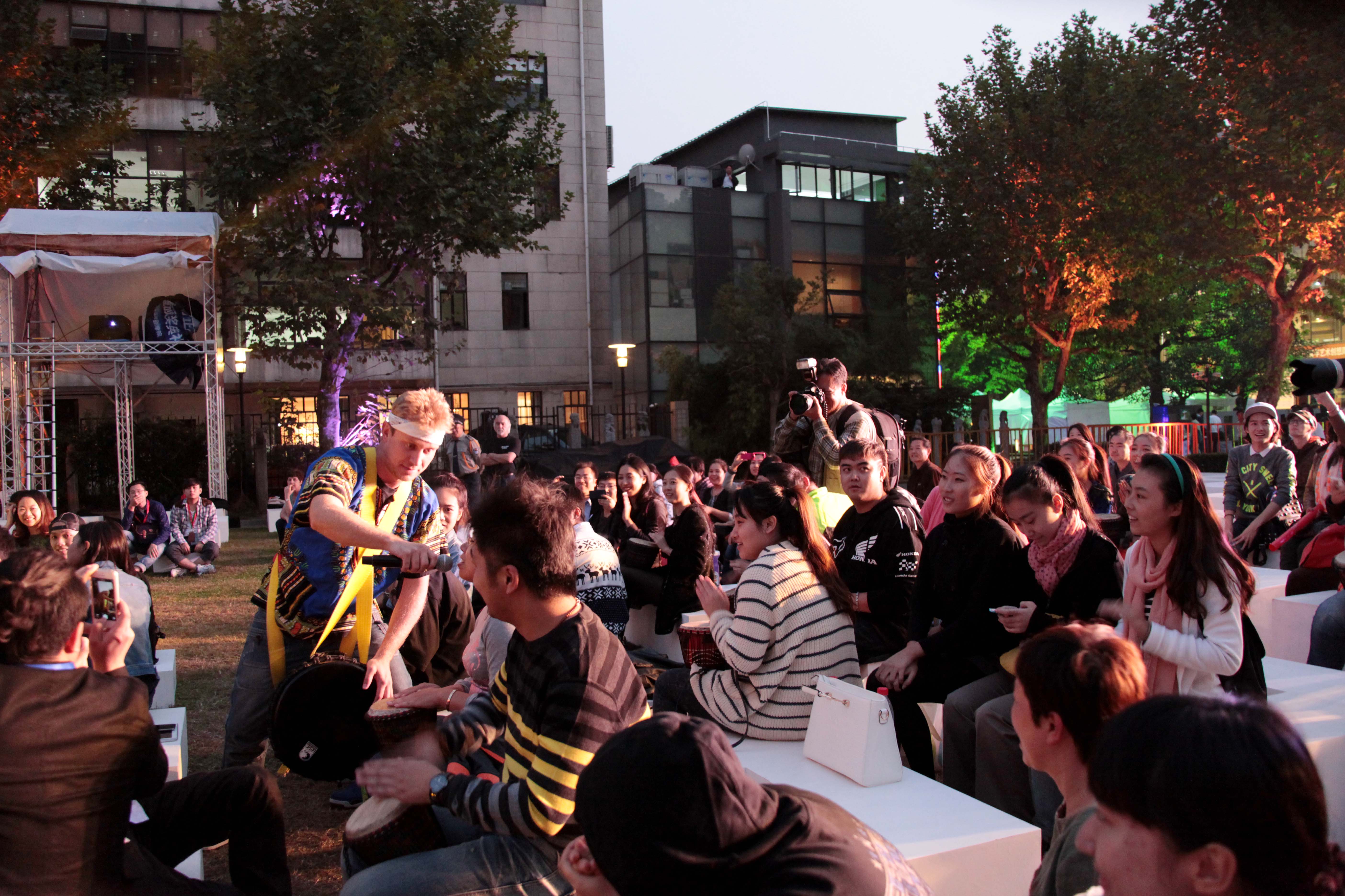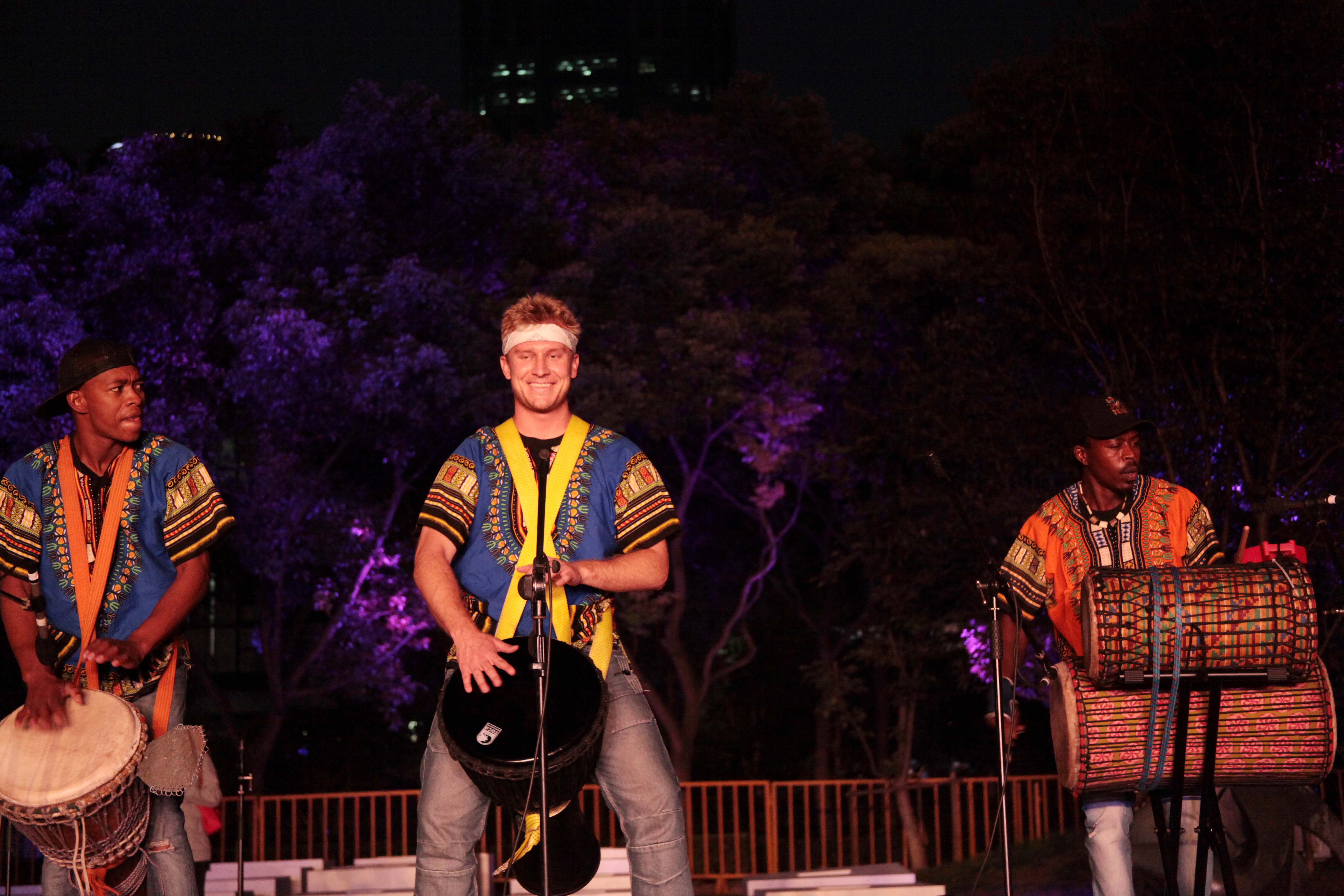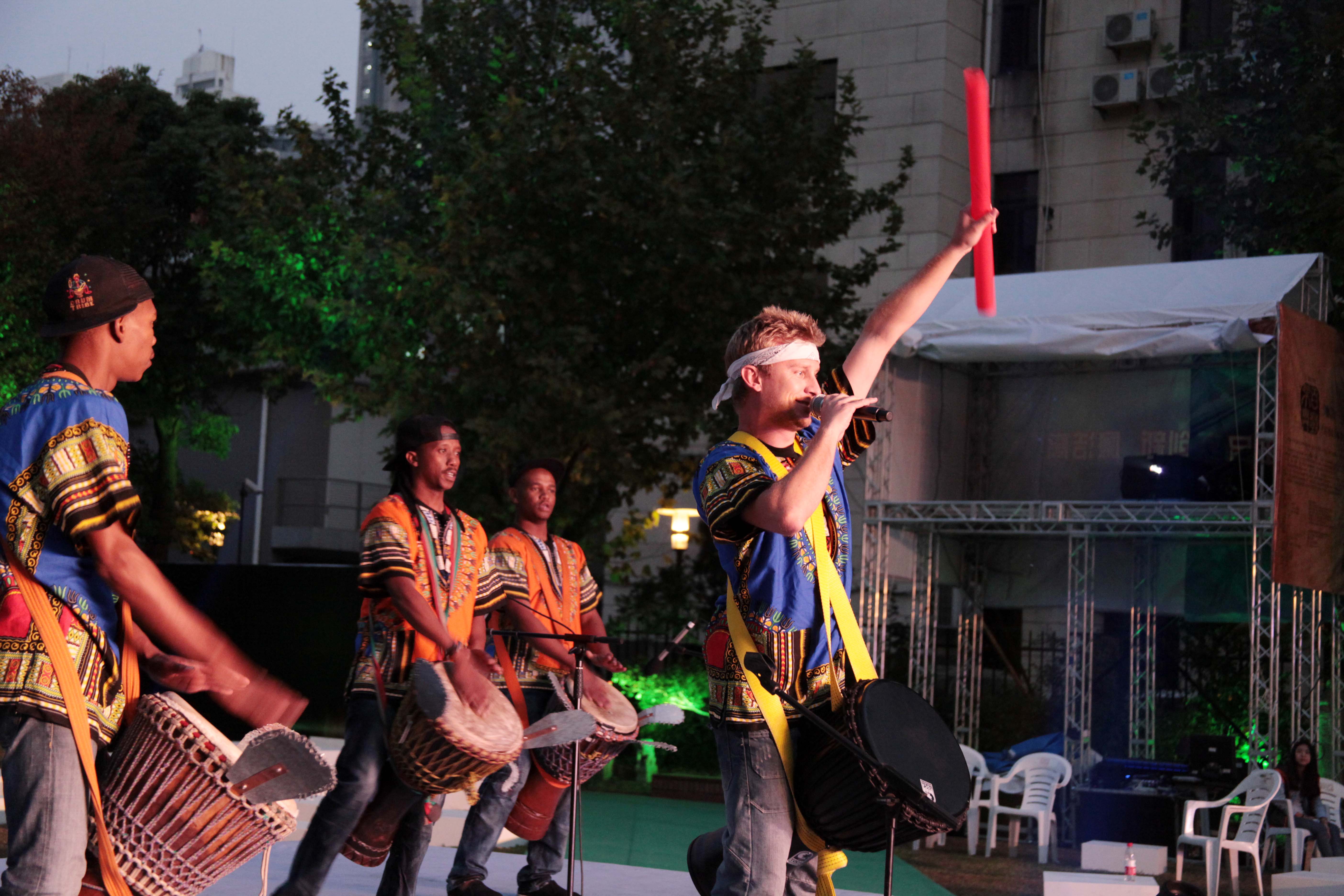 南非大鼓表演过程中,不仅有上面说的表演者带动台下气氛,同时也包括现场节奏感极强的音乐以及酷炫的灯光,让红楼前平日里安静的草坪一瞬间成了一个动感十足的大舞台。草坪上无论是年老的长者、年幼的小孩子,或者是朝气蓬勃的青年都跟着音乐和灯光一起拍着手掌晃动着身体投入地打着节奏。