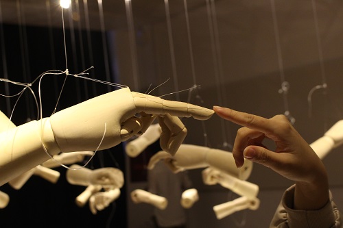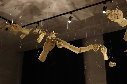 映入眼帘的是占据了房间中央区域的悬在空中的一排排大小不一的木质手,仔细一看,每只手由一根弯弯曲曲的细铁丝连接至天花板,每只手都有自己的简易关节,到手腕处由一个平面切割作为结束。每只手的形态,所指方向又不尽相同,从细微之处隐约指示着某些因果。