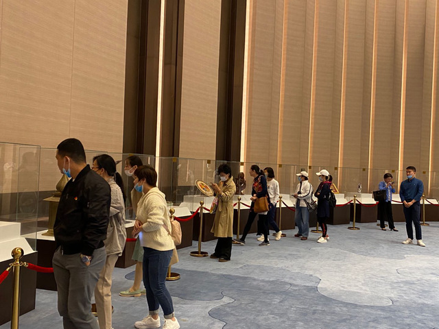 整场活动分为主会场观览和主题座谈两个环节。在观览环节,党员们一边仔细参观、用心感受,一边认真聆听马老师从建筑建造特色、场馆功能分布、书画雕塑等艺术装饰的由来及其寓意等诸多方面进行的细致导览。大家为进博场馆的宏大气势、高精品质及其内中的艺术巧思与科技智慧而赞叹折服,更为其中喷涌而出的当代中国开放、合作、创新、共享的大国风范而感到由衷自豪。