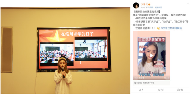 来自戏文系的文雅仪同学是校内综合奖学金一等奖的获得者,她称得上是“资助小网红”,她在暑期通过在小红书、微博等平台发布小视频的方式介绍国家助学贷款、国家助学金等资助项目。她的宣讲小视频,播放量超过万次,并持续在各大宣传平台回复咨询,累计向41人回复了超过250条信息,加起来有6000多字。这样的“网红”,每个人都应该给她点个赞!