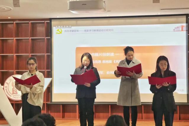 上戏师生“庆祝中国共产党成立一百周年读党史一百天”活动也于同日启动。从3月24日开始到7月1日,这项活动第一阶段正好持续整整一百天。在启动式上,创意学院党员师生代表饱含深情地朗读了《共产党宣言》《论人民民主专政》习近平同志《论中国共产党历史》等著作的片段。师生们还高唱《唱支山歌给党听》《没有共产党就没有新中国》等歌曲,呼应了这些著作中的主题。