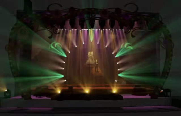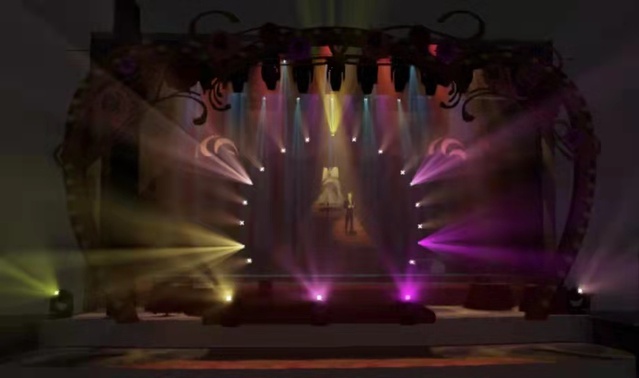 灯光设计将先使用多种不同光质的灯具保证舞台整体氛围的饱满,再加以追光、区域光点睛,舞台画面层次分明、虚实结合。