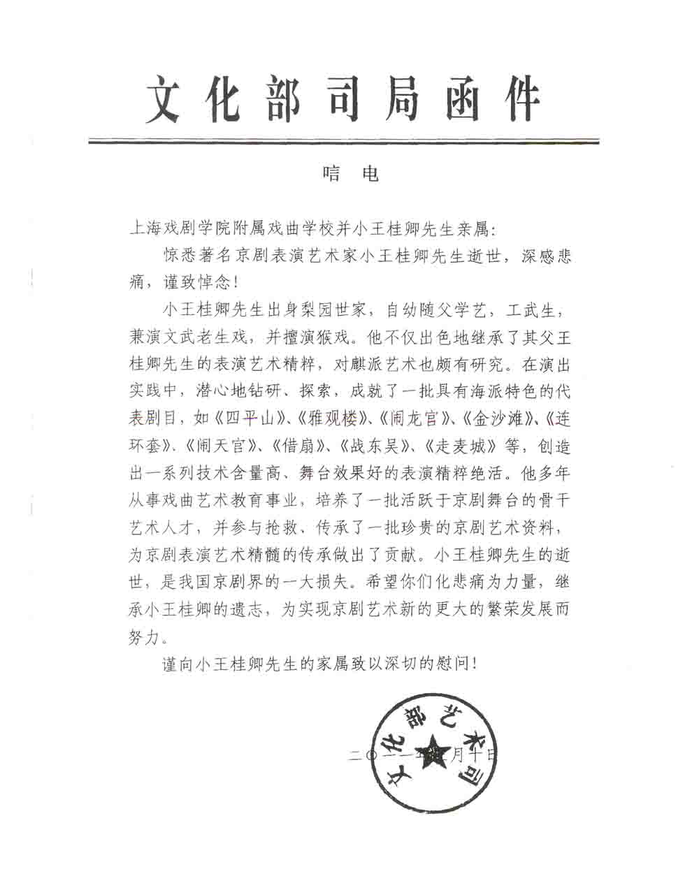 小王桂卿先生一生淡泊名利,唯重戏事。他虽然故去了,但他为戏曲艺术苦心孤诣、传薪千秋的精神留在了每一位戏曲人的心中,激励他们为实现京剧艺术新的、更大的繁荣发展而努力。