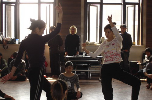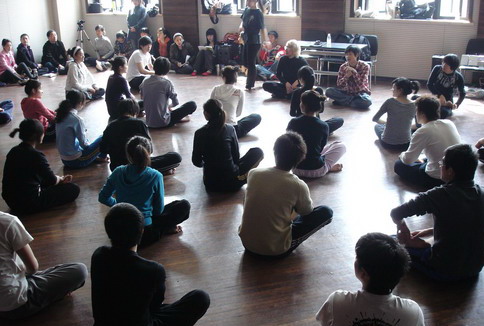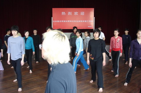 42下午1点半,在红楼东排小剧场,我们开始了第一天的表演工作坊。日本著名的舞台剧导演长野和文及两位助教给我们带来了新鲜有趣的表演训练。参加这次活动的主要是表演系07级本科和0708MFA学生以及表演系的老师。