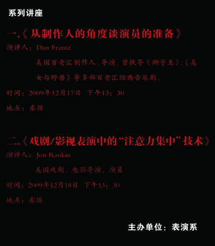 12月18日下午13:30,我系还将于红楼东排举行《戏剧/影视表演中的“注意力”集中技术》,主讲人Jon Rankin是美国戏剧、电影导演。
