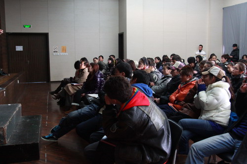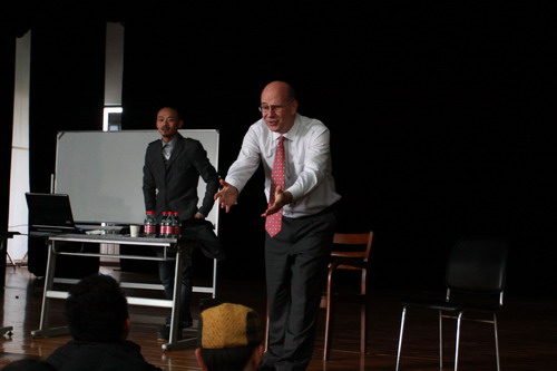 Don Frantz主要谈到了“戏剧中生活”和“中国戏剧现状”这两个方面。他在给我们讲课时突然从台上走下来,边讲边穿梭在同学中间,他以此举了个例子,认为戏剧就像人生一样,都是从狭窄的通道中走过,同学们非常认同。的确戏剧中的生活,也就是夹缝中的生活,我们靠自己的努力,在夹缝中生存,并在夹缝中找到属于自己的快乐,活出自己的精彩。谈到这方面时,Don Frantz还回忆起他生活中的一些坎坷,并以这些例子教会我们怎么去看待自己所做的一些事,让我们做一个“ok”人,对凡是都抱着一颗说“yes”的心态,通过自己的努力在今后的事业中取得成功。之后他还以幻灯片的形式,为我们分析了中国戏剧的现状,了解中国和外国之间的戏剧文化差异。