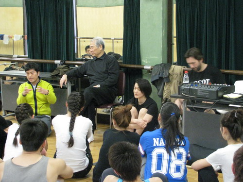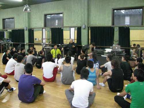 刚看到他时就觉得他是一位很慈祥的老爷爷,满脸的笑容,说话很和善,我们互相自我介绍了以后,很快就进入了我们的课题,这才看到铃木忠志先生的严格和他的学生的认真。他教学的三个点主要是:1制造能量,2调节呼吸,3支配重心。铃木先生让我们做了些练习,第一个练习,是在日本民族式的音乐中我们有节奏的踏步。踏步的时候上身自然垂直不能晃动,一样的节奏下全脚掌直接往下落地,做这个练习脚会很痛很痛,在做这个练习之前铃木先生就告诉我们做这个练习如果脚不疼那就是没有认真做。能量,氧气,重心都不是我们肉眼能看见的,所以在我们的日常生活中也没有受到重视。但是,其中任何一项发生问题都会对我们现代社会中的个人生活和社会生活有很大的影响。这三项功能其实是互相关系的,要生产更多的能量,身体就需要更多的氧气,也就会因此而加强呼吸,我们通过铃木先生教的这些练习来个别强化这三个功能,那样我们生命力也会更强。