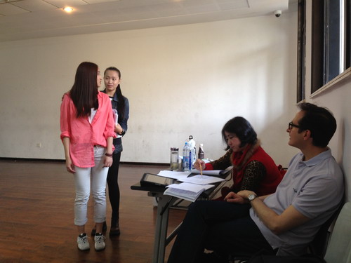 在进行完剧本分析后,几位同学立刻开始了背台词等工作,随之而来的便是进入场景走位。在排练中,严谨的大卫会不断提出新的想法,有时一个小小的走位都会来上许多遍,但他始终充满着热情和耐心,同学们也不断调整自己,努力达到大卫的要求。当然,由于经验不足、与外国人的交流障碍等问题,在排练中同学们也遇到了一些小麻烦。但是,在大卫的耐心指导、翻译老师的悉心解释和同学们的积极配合下,排练保持着每天一场戏的进度顺利进行着。
