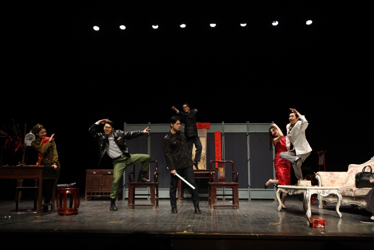第四个片段来自宋之的编剧的《群猴》。这是一出独幕讽刺喜剧,反映了上个世纪40年代中后期,国民党在国统区某大城市搞竞选国大代表的活动,为争当伪国大议员,各种势力的代表人物粉墨登场,为买卖选票争吵叫骂甚至动刀动枪,本剧对国民党国民代表大会代表竞选丑行进行了辛辣的嘲弄与揭露,活像一群丑态百出的猴子,极具讽刺意义......表现了作者的讽刺艺术才华。相较于前三场2-3位演员,这出戏登场人数较多,但台上闹而不乱,每个角色都极为精彩。恢复线下教学后,同学们对舞台更为熟悉,在台上也更加自如了。