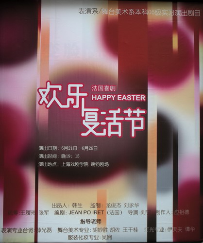 6月21日—6月26日晚19:15,表05(2)班实习大戏《欢乐复活节》将于端钧剧场上演。