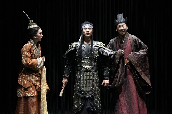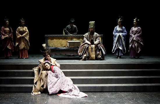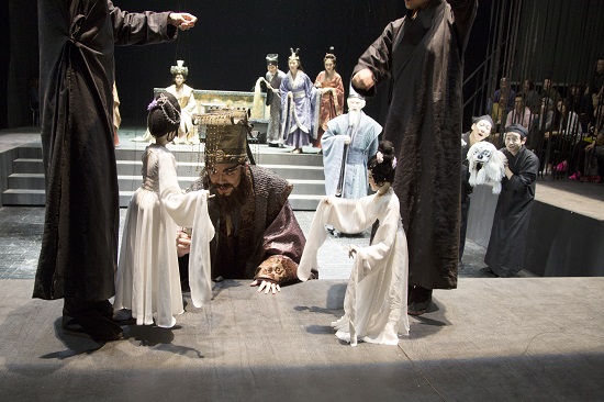 话剧《大面》由罗怀臻编剧、何雁导演,是上戏表演系戏剧影视本科班11级一班的毕业剧目、舞台美术系本科班12级的实习剧目,也是今年的“上戏有戏”系列展演的剧目之一。同时,作为“多用途新媒体剧场上戏剧院示范工程”的示范项目之一,受到了上海市科委科技创新行动计划的支持。该剧以北齐名将兰陵王的历史传说为脚本,刻画了一段壮怀激烈的爱恨情仇,探讨了人类的天性和欲望,讴歌了奉献精神和人间真情。而在舞台演出方面,则注重在极简的几何空间中,将中国戏曲艺术、木偶艺术、舞蹈艺术与当代戏剧艺术的融合。导演何雁大胆地对上戏剧院的镜框式舞台进行改造,将观众席设置在舞台上。利用上戏剧院本身的空间构造,将演区与观众区无限拉近,使得观众得以近距离地欣赏演员惊心动魄的表演。主要舞台是一个0.8米的深坑,上方有数道挂满黑色布条的帘幕,这些写意性的舞美设计,营造出充满象征意义和哲学意味的舞台空间。
