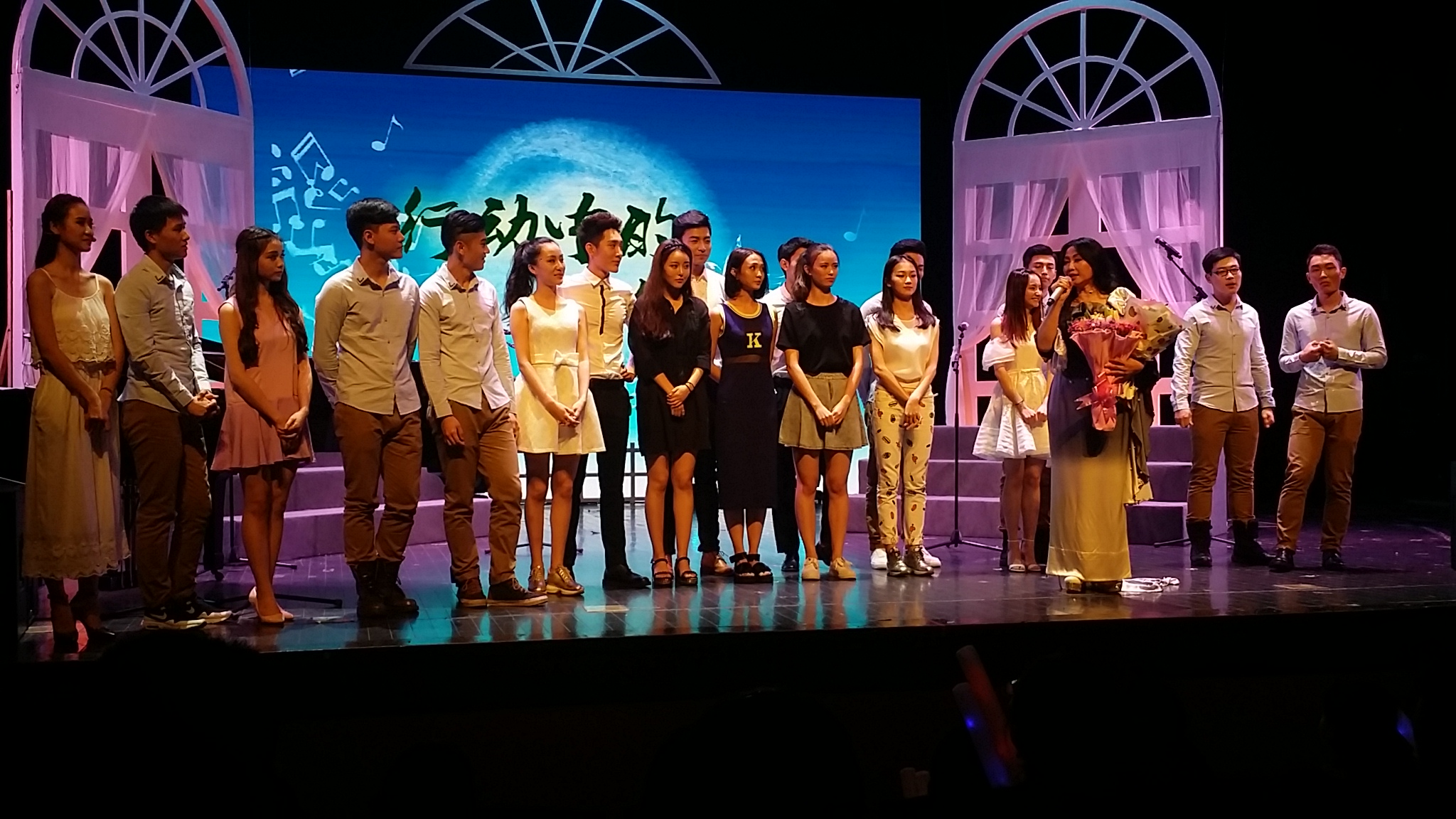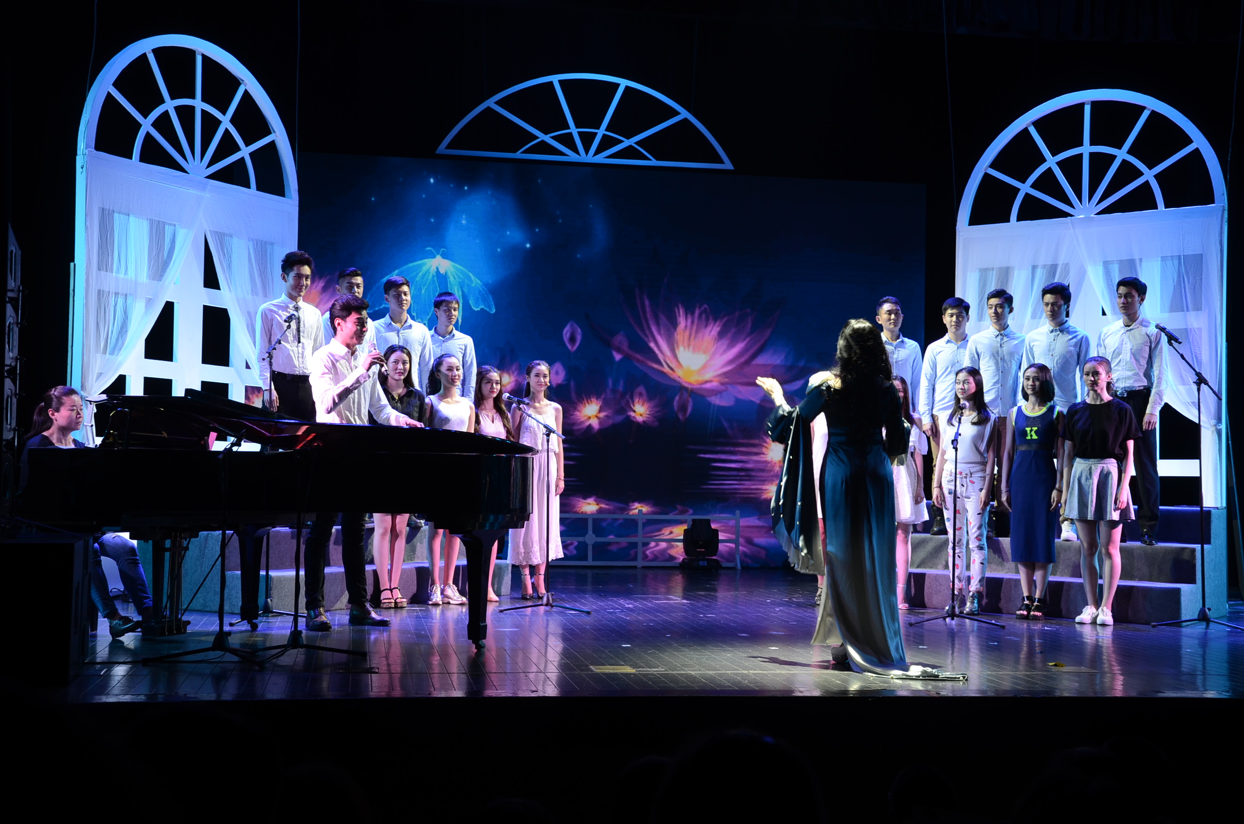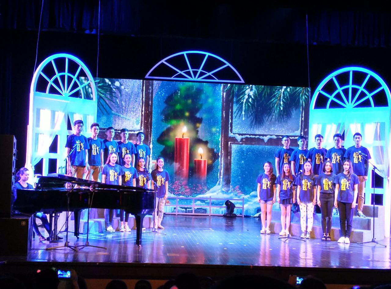 主讲教师王学明老师出品人,班主任宋颂老师策划,宋颂、余笛老师声乐指导和导演,高瑜老师钢琴伴奏,14级表演班全体学生参与,演绎了一场汇集音乐剧中外文经典曲目,舞美简洁脱俗不简单,舞台表现形式多样变换,有大合唱有小合唱有个唱,学生综合能力表现淋漓极致体现平时的用功,男生声乐水准自然流露博得不断现场喝彩与微信点赞,宋颂老师通过改编一些流行曲目用浑厚底蕴歌声诠释新内涵,从歌声大连串表演体现了音域宽广、高低流畅的声学功底,从改编的俄罗斯曲目体现了对俄罗斯风格的理解与融入新元素创新,尽管学生已经放假回家,剧场仍然座无虚席两侧过道站满了人,学生家长欣慰见证孩子的成长过程,观众反响热烈,不时挥舞荧光棒,掌声不断,高潮迭起。表演班学生通过短短一学年的声音基础训练,用音乐会演唱方式让观众检验教与学,学生们的精湛表演展现老师们的辛勤付出和对学生的一片爱心,是一场学生为主具有专业表演水准的校园音乐会,是专业艺术大众化娱乐化的一场盛宴,是一次至善至美的校园戏剧精神的诠释。