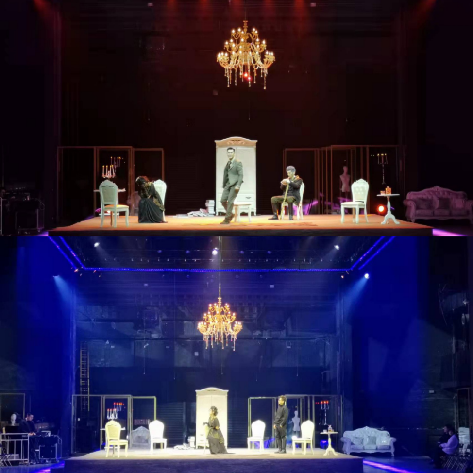 舞台上,演员们在光幕之间倾情展现19世纪末俄罗斯的封建贵族家庭境况,在加耶夫和柳苞芙哀伤而温情的回忆中体验生活的消逝和衰败。在层层递进的剧情展开和现场乐队演奏中,观众们随着演员的一呼一吸和一张一弛而深深共情,感受平淡忧郁和暗哑惆怅的情感。没有强烈的戏剧冲突,只有不断的家庭回忆,伴着浓烈的生活诗意,樱桃园在缓缓消逝流失。