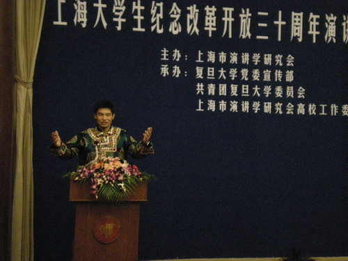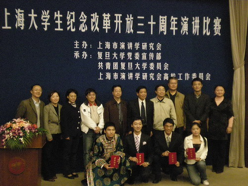 上海大学生纪念改革开放30周年演讲比赛昨天(11月18日)下午在复旦大学逸夫楼报告厅举行。复旦大学校长助理桑玉成代表承办单位向来自上海27所高校的选手表示欢迎。经过激烈角逐,我校内蒙表演班选手尔奇斯与华东师范大学赵梦然、同济大学苏龙霞、上海中医药大学陈醇一起荣获一等奖。上海市演讲学研究会会长刘德强、上海市教卫党委宣传处副处长劳晓芸、上海市教委德育中心主任王垒、上海教育电视台副台长张伯安、上海市演讲学研究会秘书长姚俊吾等领导担纲评委并向获奖者颁发证书。