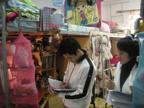 自治委员会一行首先来到女生宿舍,大家感叹女生宿舍普遍很不错,屋子很干净,物品摆放整齐,屋内还喷了些香水,很有情调。陈老师说,简直都像是宾馆一样。看样子,音乐剧班的女同学们,在宿舍卫生方面下了不少的工夫啊!