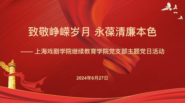 为认真学习领会习近平总书记关于全面加强党的纪律建设的重要论述,扎实开展党纪学习教育,深入推进继续教育学院廉洁文化建设。继续教育学院党支部于6月27日下午在昌林校区2号楼4楼举办了“致敬峥嵘岁月,永葆清廉本色”为主题的主题党日,上海戏剧学院校领导及学校各支部党员代表参加了观摩交流。