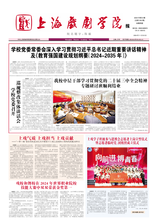 《上海戏剧学院报》2024年第8期(总第352期)已于2024年11月25日出版。重点内容有:《学校党委常委会深入学习贯彻习近平总书记近期重要讲话精神及<教育强国建设规划纲要(2024-2035年)>》《学校党委召开巡视整改集体谈话会》《我校中层干部学习贯彻党的二十届三中全会精神专题研讨班顺利结业》《上戏气质 上戏担当 上戏贡献——“一带一路”国家传统表演艺术节暨第十二届上海国际小剧场戏剧展演举行》《戏校和舞校在2024年世界职业院校技能大赛中双双荣获金奖第一》等。敬请关注,也可点击下载阅读。(文、编辑:榕树)
