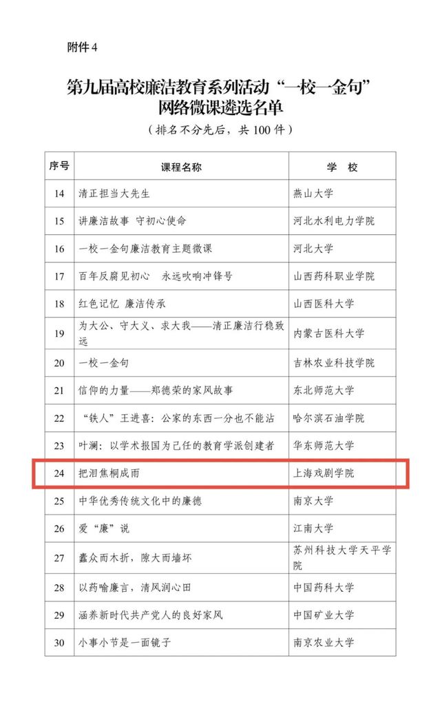 树牢系统观念,注重统筹谋划,构建“党委领导-纪委协助推进-院系部门跟进落实-师生共同参与-交流展示共进”的全链条机制,形成齐抓共管、各负其责工作格局,建立健全富有特色的廉洁文化建设工作体系。一体推进廉洁教育、课程思政与文化建设,注重激发内生动力和主体能动性,聚专业优势,汇各方合力,凝基层品牌,展院校风采,注重将思想锤炼、党性修养和廉洁规范贯穿于立德树人全过程,增强“廉育力”,推动构建“院系有特色、人人重廉洁”的全场域廉洁文化工作机制与清廉校园共生赋能。上海戏剧学院纪委、党委宣传部制作出品的《把泪焦桐成雨》微课视频入选教育部第九届高校廉洁教育系列活动“一校一金句”网络微课优秀作品并在央视网等平台进行展播,产生良好社会效应,生动展现习近平总书记《念奴娇·追思焦裕禄》的铿锵词句,弘扬廉洁奉公的道德情操,厚植清正廉洁的文化土壤。